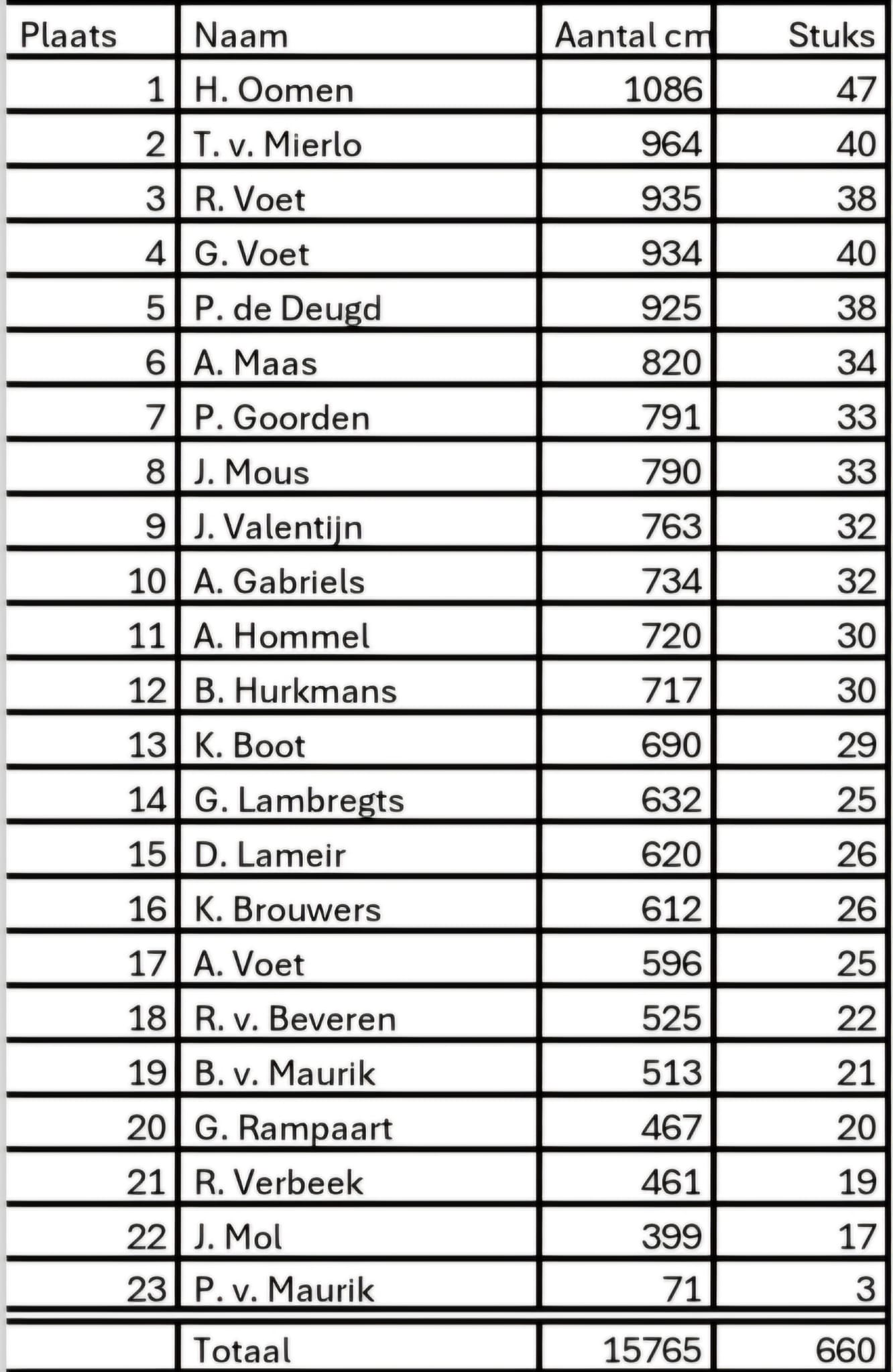 Zaterdag 1 februari werd alweer de 1e bootwedstrijd 2025 van GBV gehouden met de ms. Theo vanuit Vlissingen. Winnaar werd deze keer H. Oomen met 47 vissen, totaal 1086 cm. Tweede werd T. van Mierlo met 40 vissen, totaal 964 cm. Derde werd R. Voet met 38 vissen, totaal 935 cm. De kop is er dus weer af. De volgende bootwedstrijd zal worden gehouden op zondag 23 maart. Dan zal worden gevist vanuit Colijnsplaat met de Desiree.